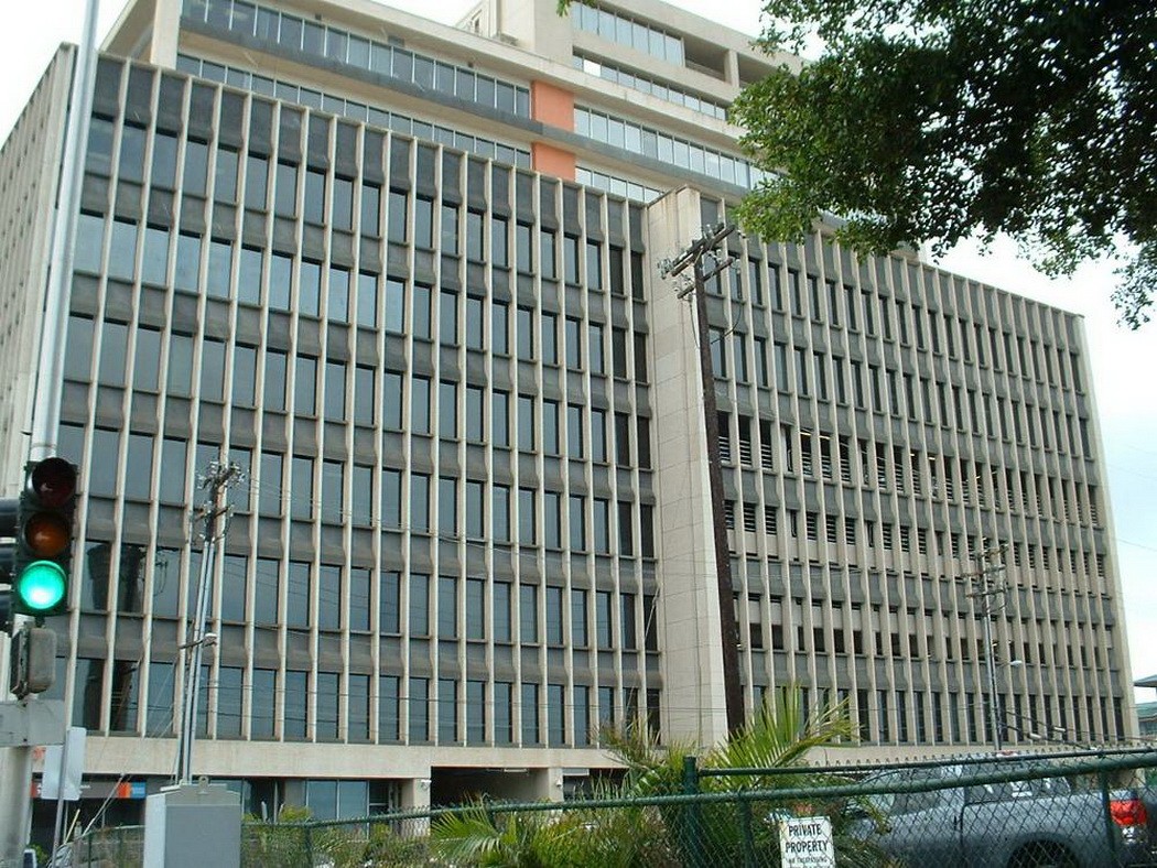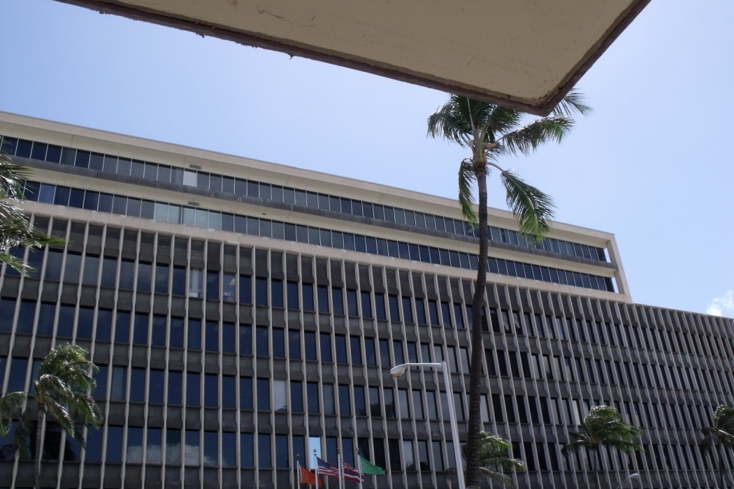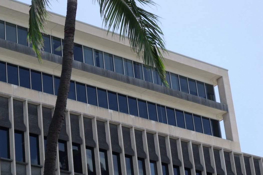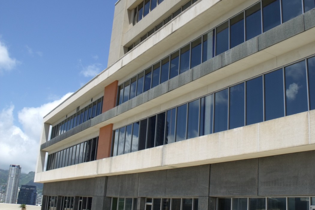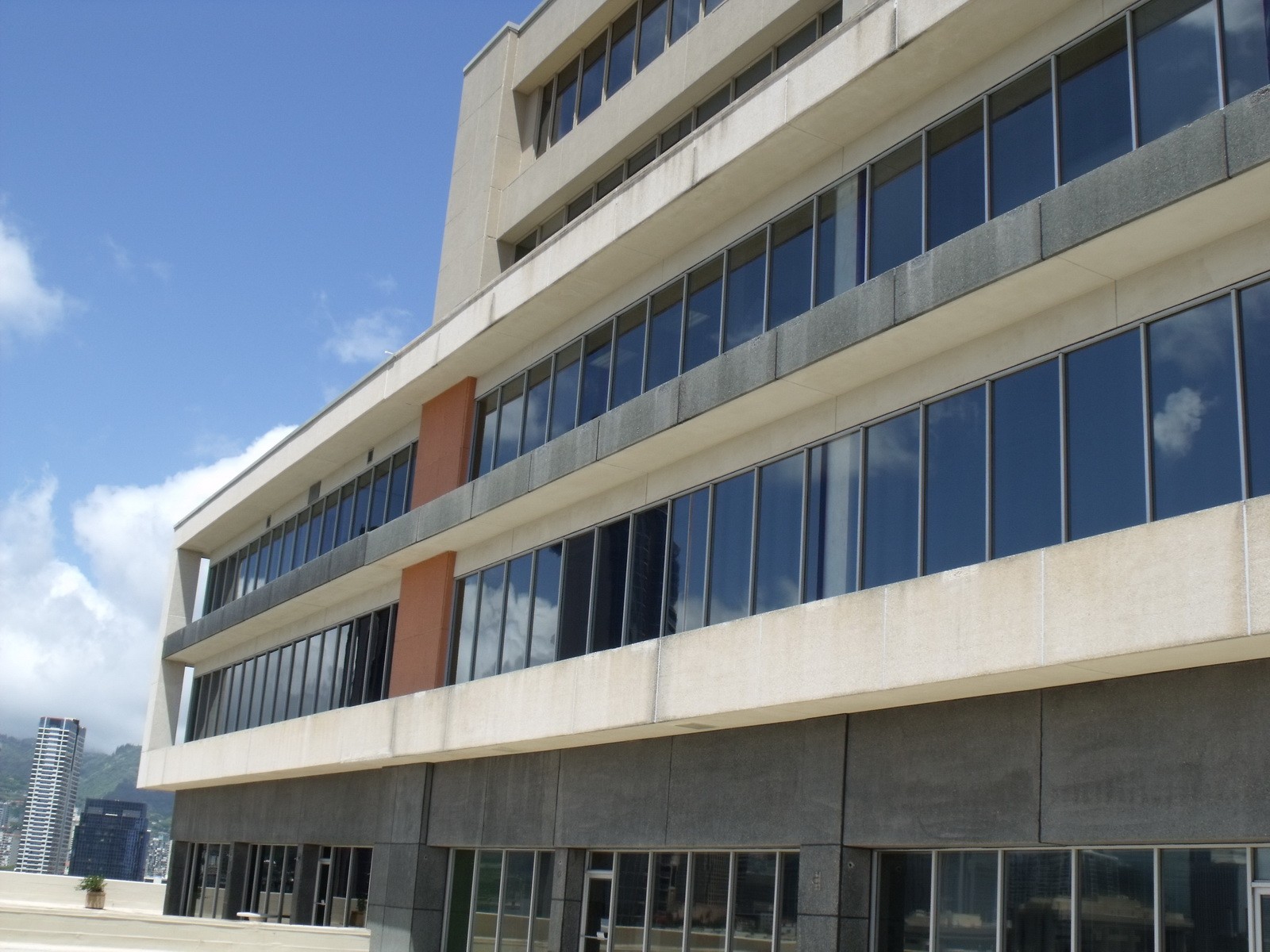 The building at 677 Ala Moana is a twelve-story structure that was constructed in multiple phases starting circa 1966 and completed circa 1971. The exterior walls are comprised of cast-in-place concrete with concrete masonry unit (CMU) infill walls, coated with paint at one elevation, and exposed aggregate precast panels and window walls at the remaining three elevations.