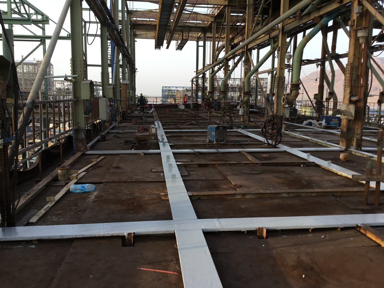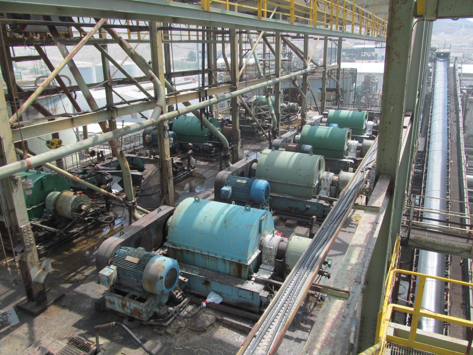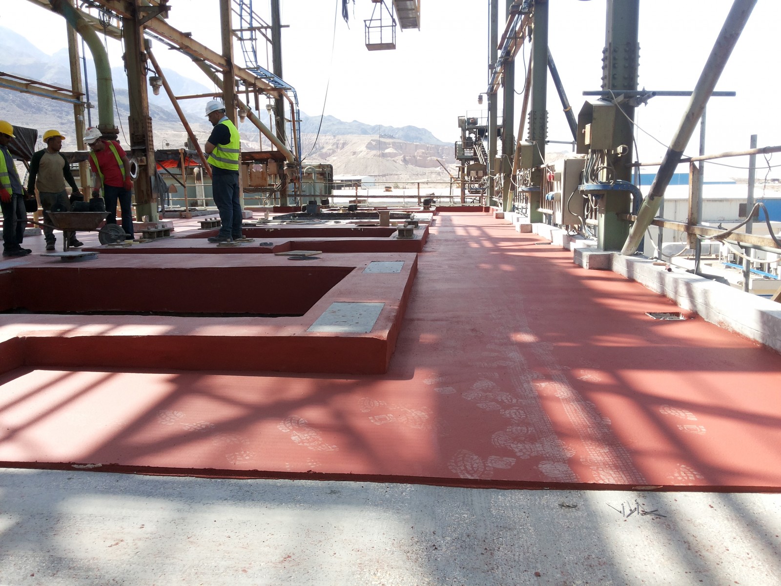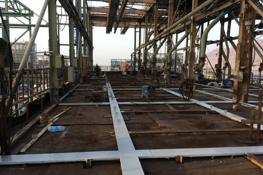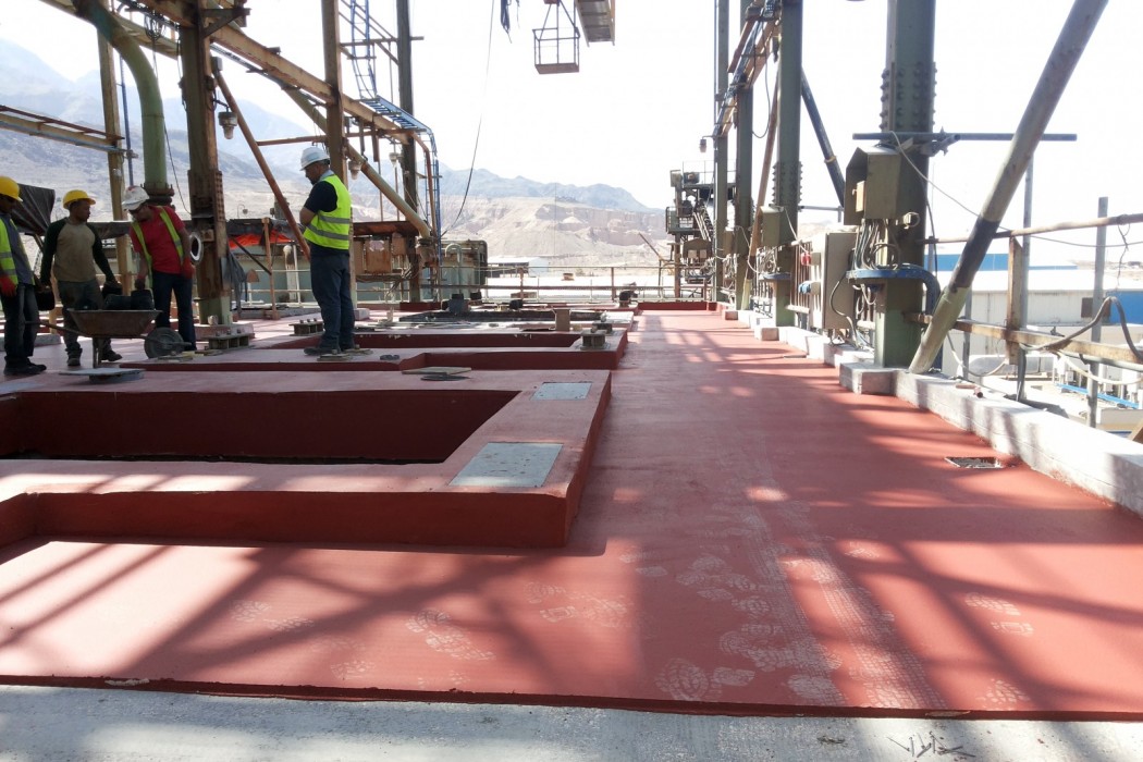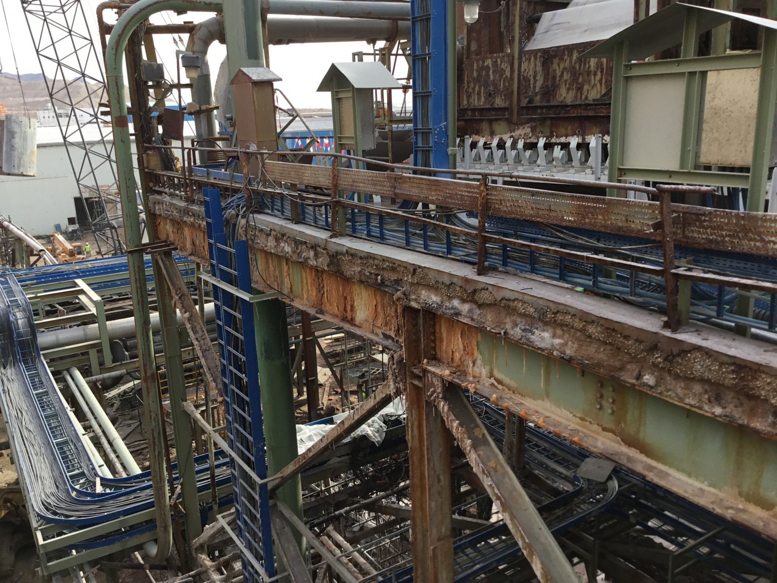 The Carnallite Structure is a 25-meter, five-story-high, open steel-framed structure constructed in the 1980s. An elevated concrete slab cast composite with the steel framing supports several centrifuge machines, which serve as an integral part of the hot leach production line at this potash plant. The equipment, which runs continuously, induces vibration into the supporting slab and sprays hot leach product, which is highly deleterious to both concrete and steel, directly onto the slab.