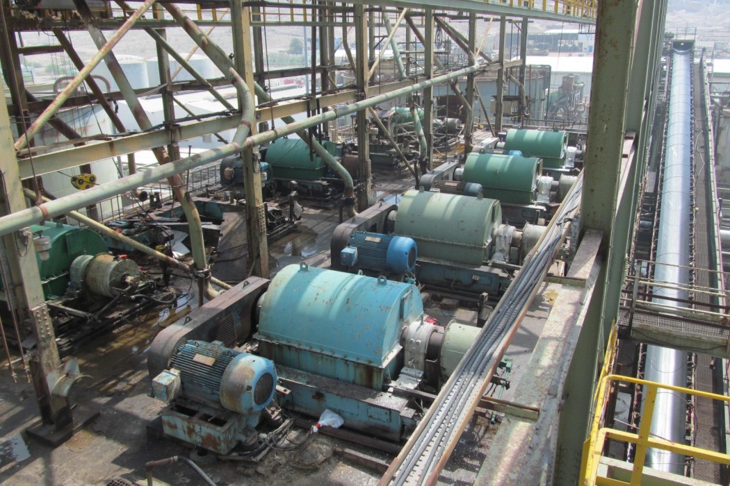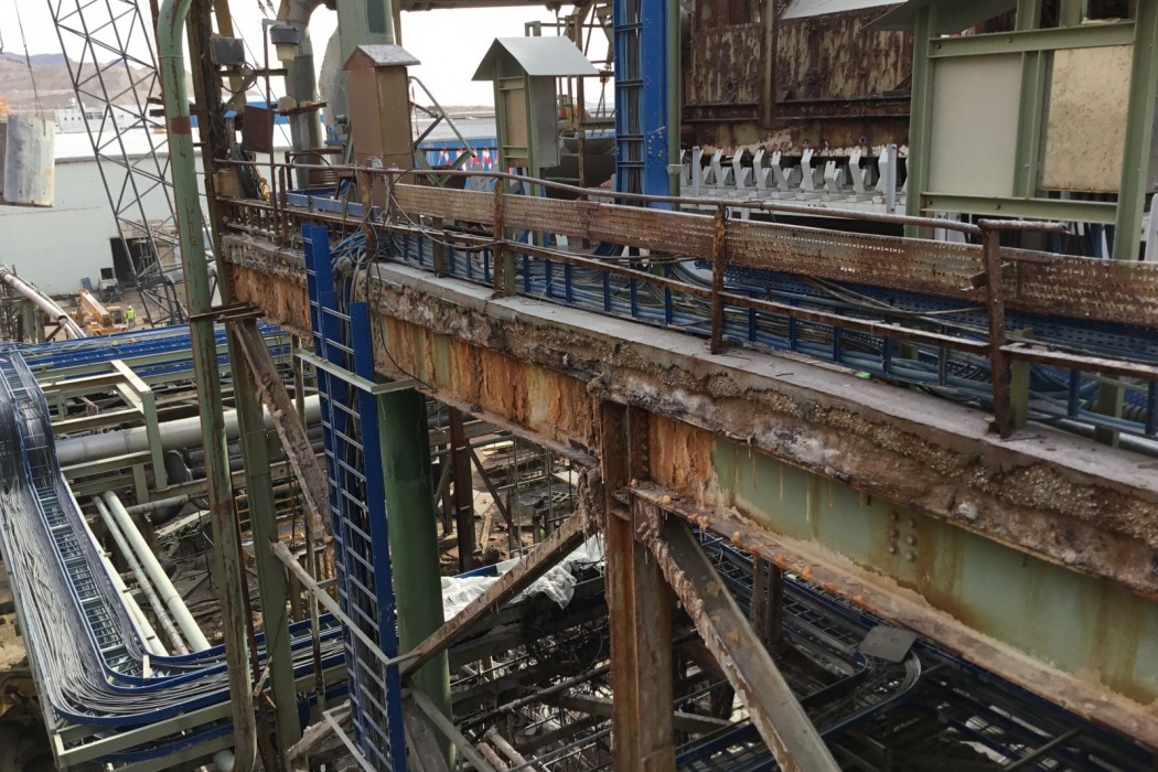 Long-term exposure to hot leach product (HLP) led to advanced deterioration of the concrete slab and supporting steel framing as well as deterioration of the concrete surface paste and corrosion of the embedded reinforcing steel. The supporting steel beams, columns, and bracing members exhibited advanced localized corrosion where the HLP product was allowed to pond. WJE was tasked with designing a replacement concrete slab capable of resisting the deleterious effects of the HLP while being able to support the dynamic loads from the centrifuge machines.