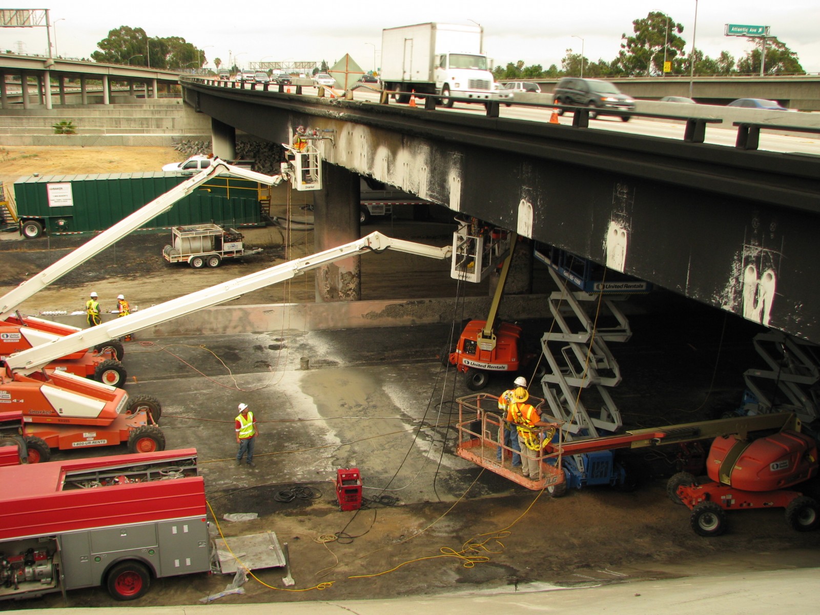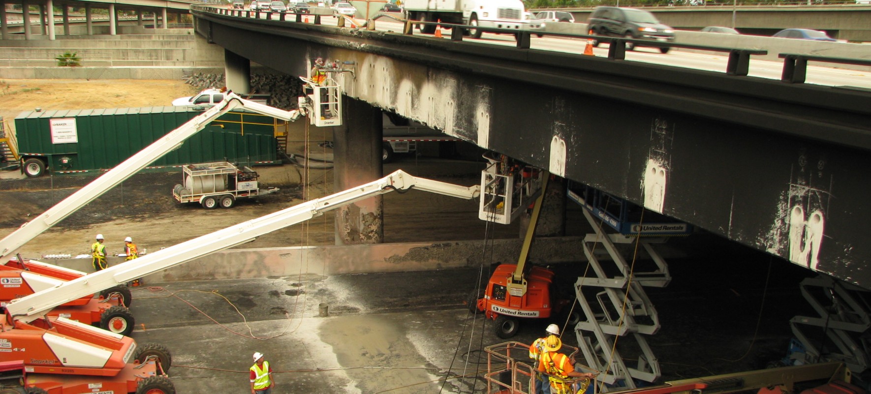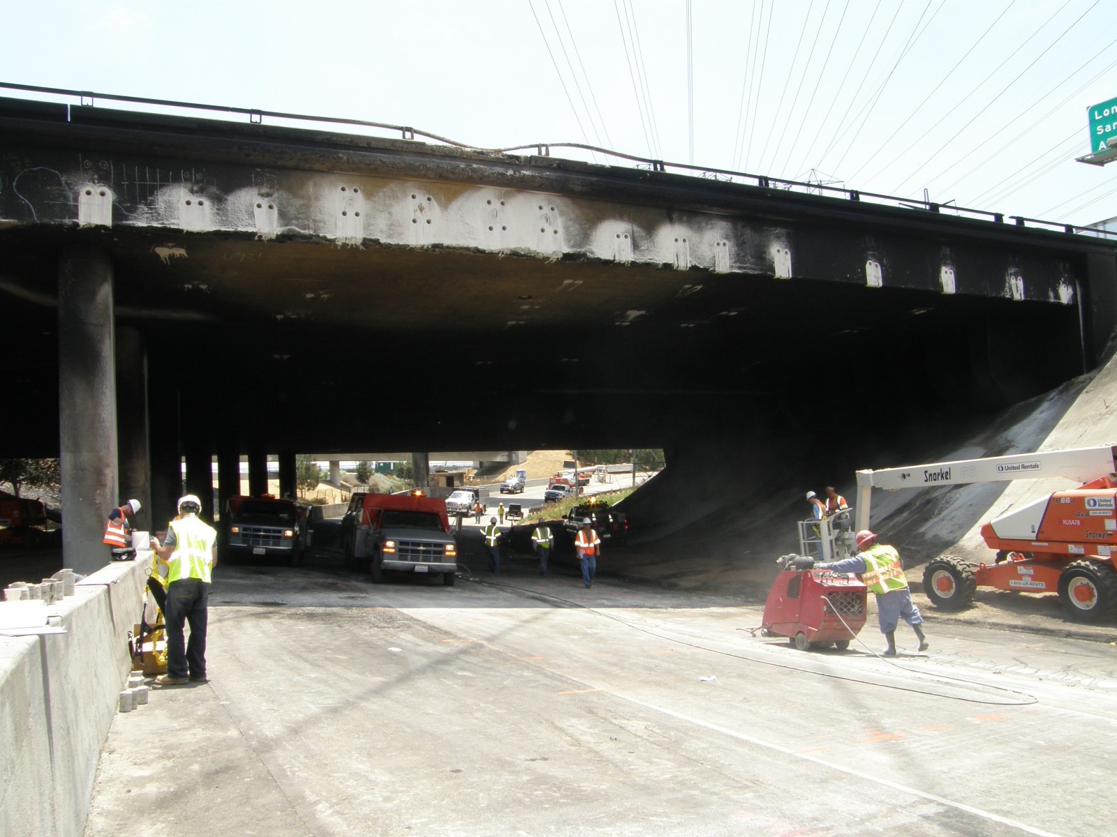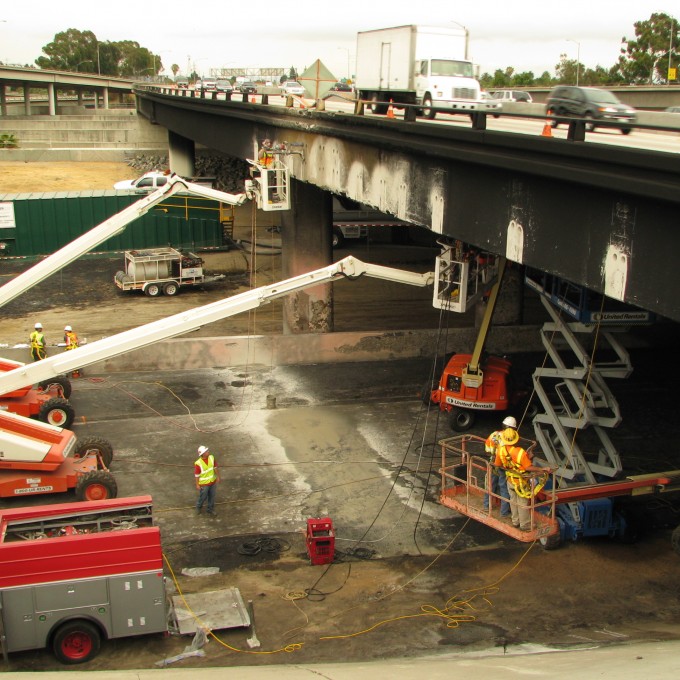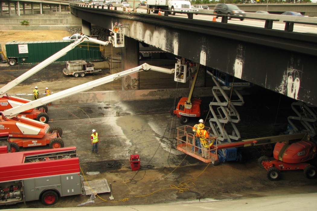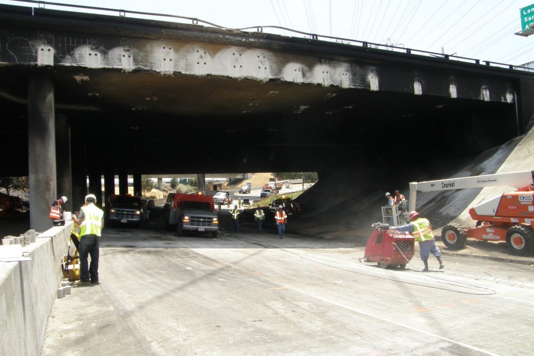 A tanker truck reportedly carrying 8,000 gallons of ethanol crashed and caught fire at the interchange connector from eastbound State Route (SR) 91 to northbound Interstate 710, under the westbound lanes of SR-91 in Long Beach, California. The fire caused damage to the underside of the SR-91 overpass. Through an existing contract with Flatiron Construction Corporation, the California Department of Transportation (Caltrans) retained WJE to evaluate the damage and to recommend possible repair methods and techniques.