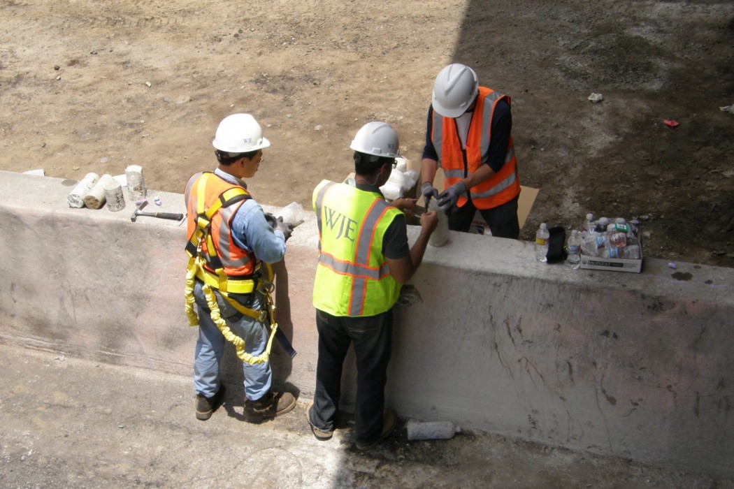 Mobilizing members from WJE's Los Angeles, San Francisco, Austin, and Northbrook offices to respond to the emergency, a team of six engineers was working on site within twelve hours of receiving the request for assistance. WJE engineers performed a variety of physical and nondestructive tests on the overpass, including visual observation, acoustic impact testing, petrographic studies, compressive strength testing of concrete cores, and tensile strength testing of reinforcing steel to assess the damage caused by the fire exposure. Only ten days after receiving the assignment, the team completed all testing and provided Caltrans with conclusions regarding the condition of the concrete and recommendations for the repair or replacement of the concrete where necessary. The team concluded that the accident at the interchange connector caused moderate structural damage to the bridge supporting the westbound lanes of SR-91. The worst damage occurred to the north face and railing of that bridge, which sustained significant spalling and heat damage to the concrete.
