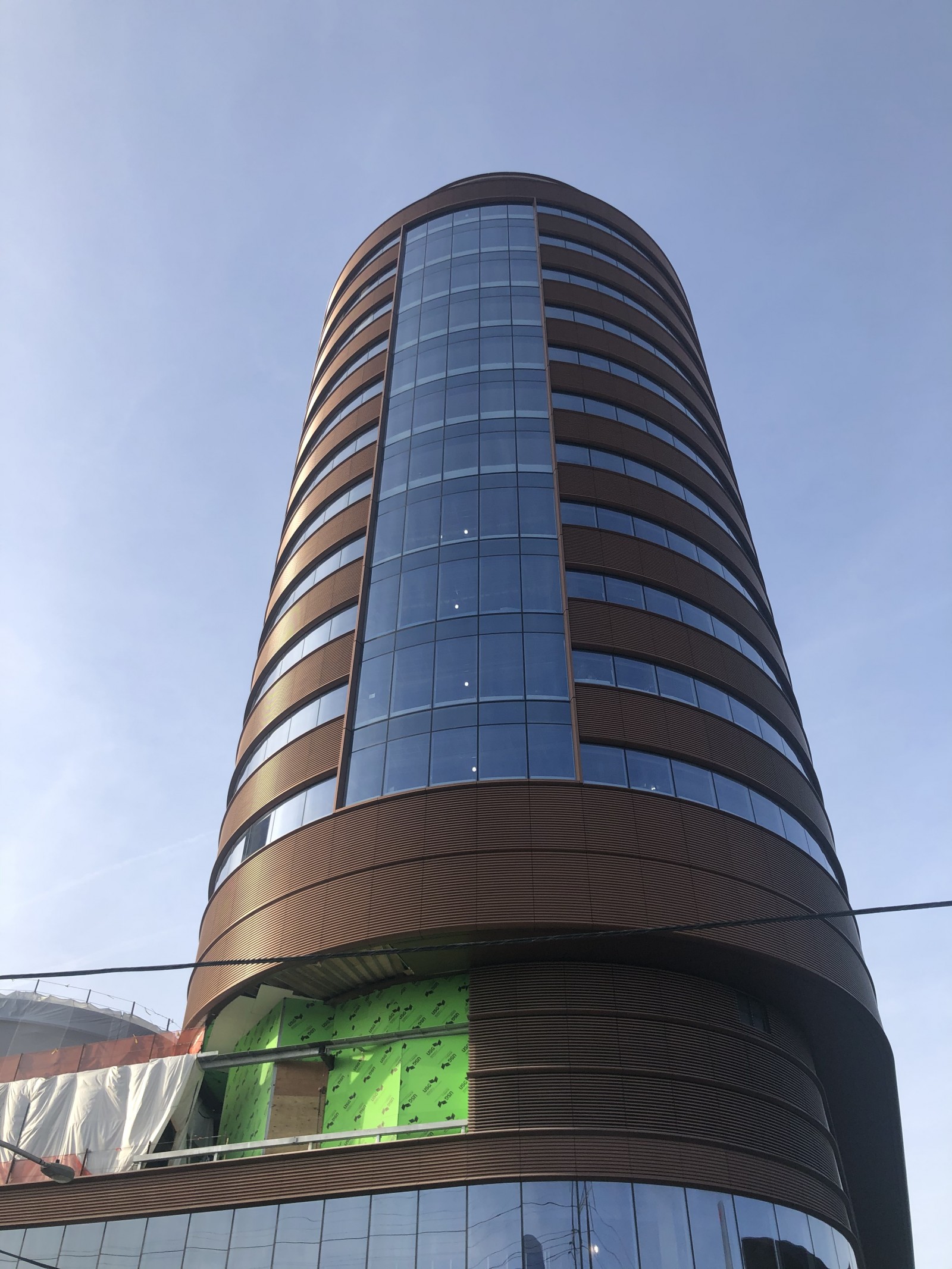 To meet the architect’s design intent and OPR, the project utilized a custom, four-sided, structurally glazed, unitized curtain wall design approach. The system provides fully integrated air, water, and thermal control layers and was designed through a design-assist process with the fabricator to limit the risk for condensation from thermal bridging through thermal simulations and design modifications unique to this building design concept. To provide further protection in a humidified environment, the curtain wall system includes built-in redundancy to manage potential condensation development and incidental water infiltration. Curved and flat extruded corrugated panels with a high-performance coating were integrated within the opaque spandrel sections of the unitized curtain wall along floor lines to provide rigidity and durability. Curved glass was also utilized instead of a faceted facade to provide smooth transitions along the extreme ends of the building.