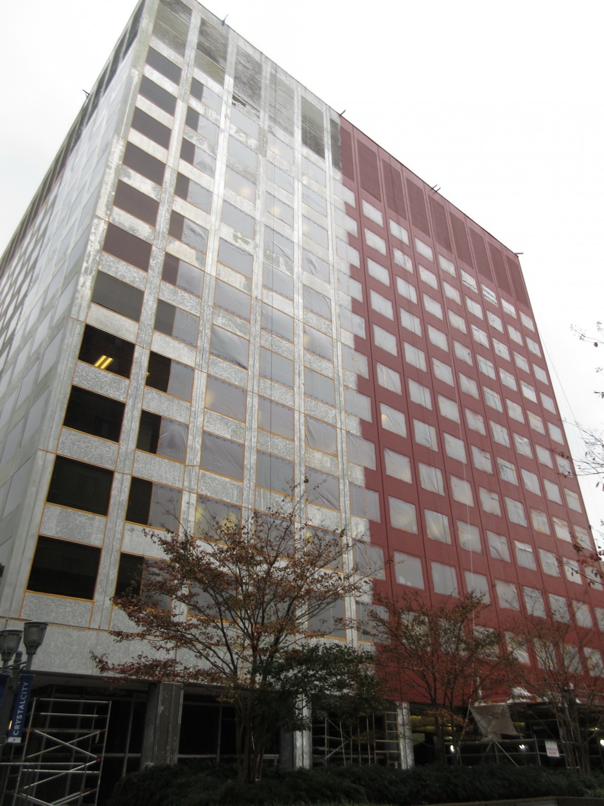 Constructed in 1973, Crystal Square 5 is a thirteen-story structure that is rectangular in plan and includes plaza-level retail space, offices, and an upper-level penthouse/mechanical space. The building facade primarily consists of metal panels and nonthermally improved aluminum punched windows, with louvers along the perimeter of the penthouse level.
