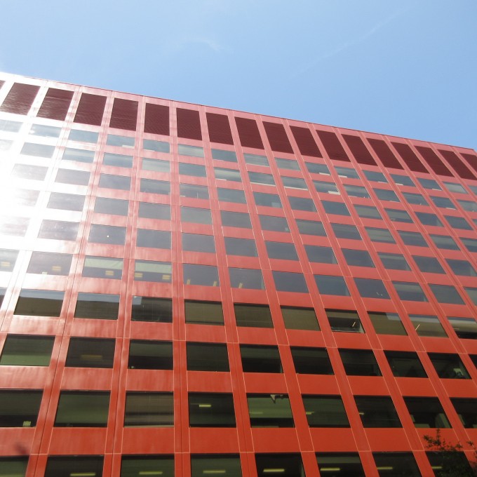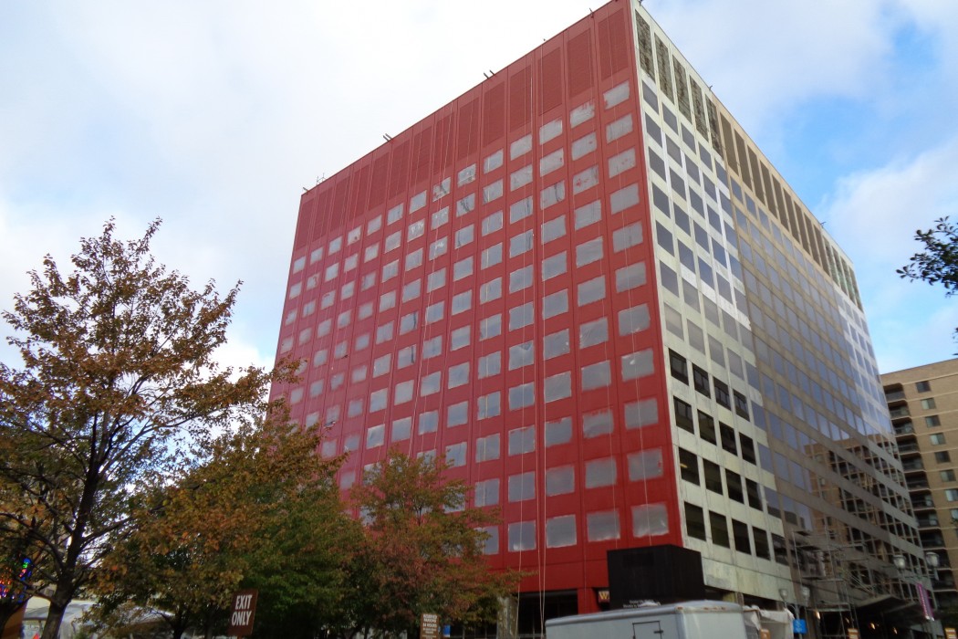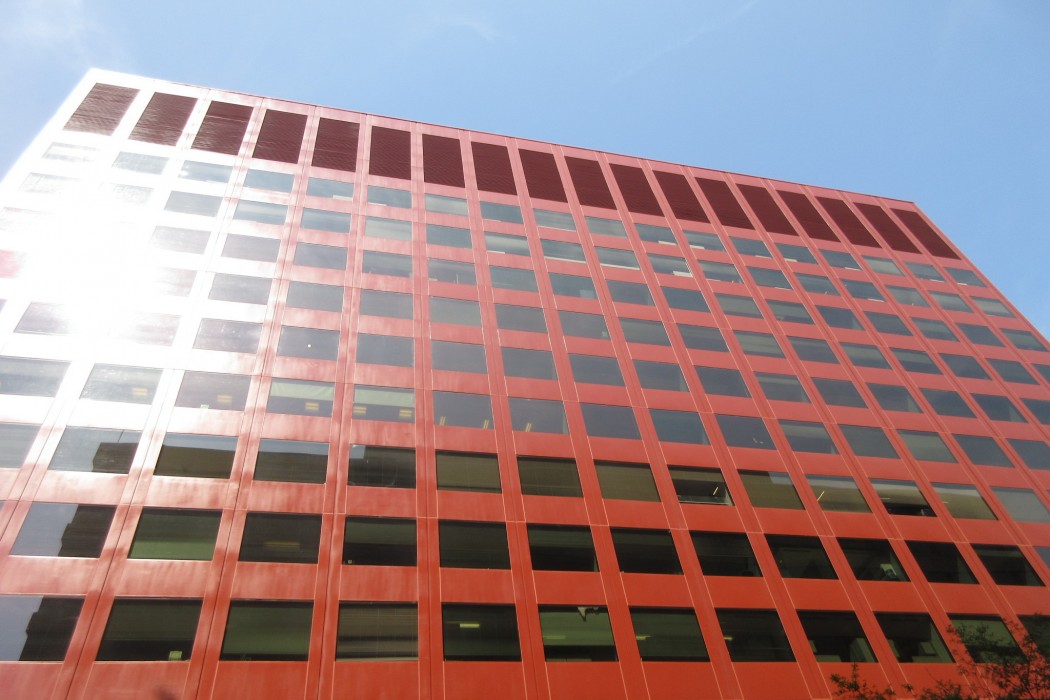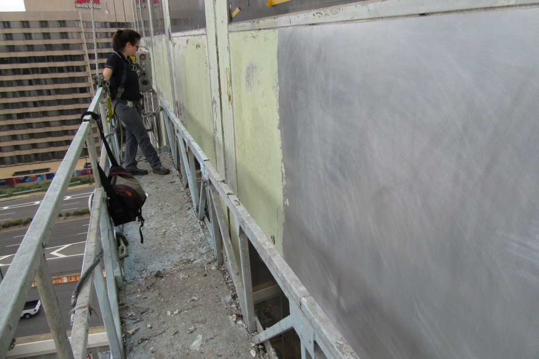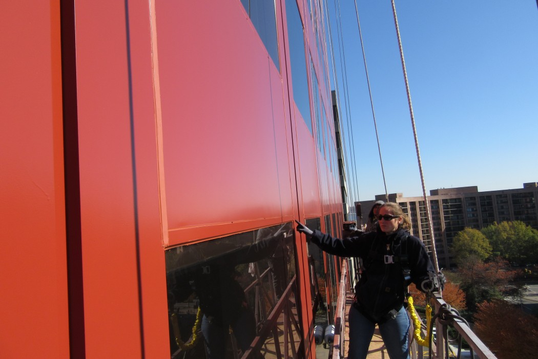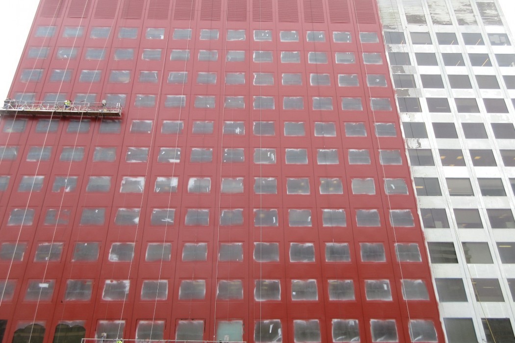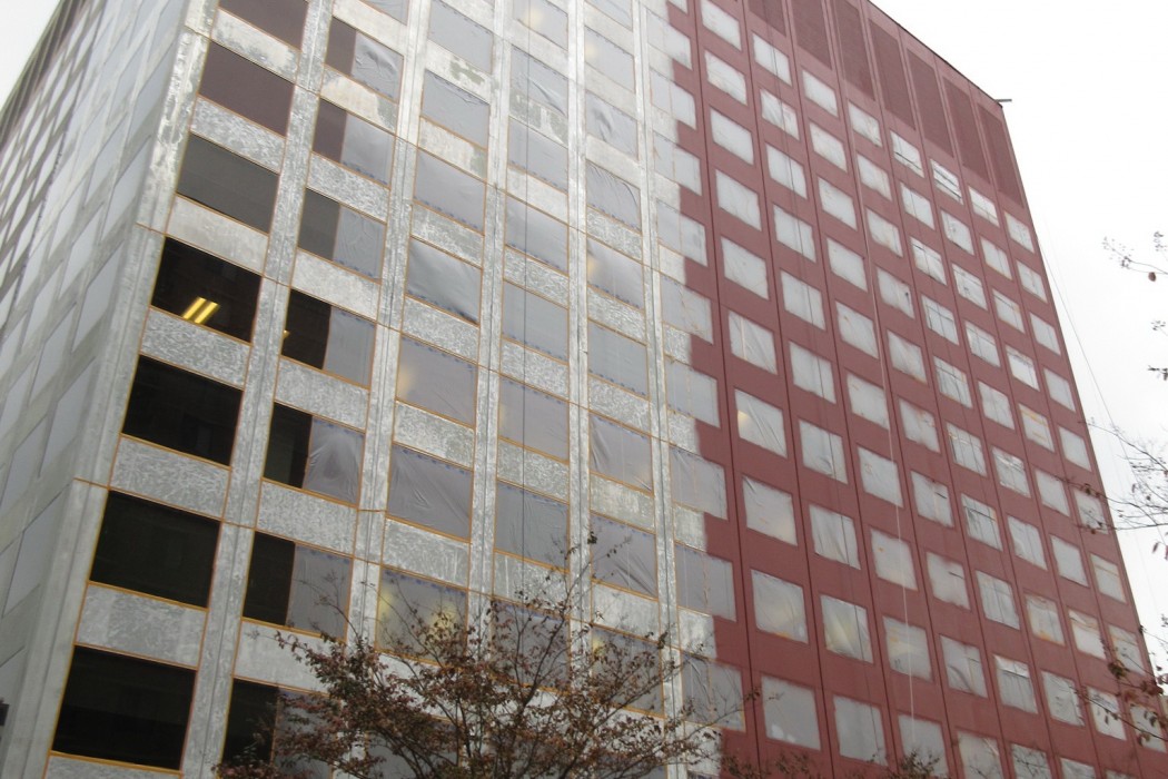 WJE completed a limited visual condition assessment of the exterior metal panels and joint sealant. To document prior repairs and problem areas, we reviewed the metal panels, window assemblies, and joint sealant, in addition to the ground-level storefronts and soffits. During the exterior survey, we also completed adhesion testing of the existing coating on the metal facade panels in accordance with ASTM D3359 and ASTM D4541. We collected coating samples for our in-house laboratory to evaluate the composition and coating types of each sample. The testing results informed contract documents pertaining to joint sealants and high-performance coatings, which were incorporated into a subsequent facade restoration project. We helped the architect of record further refine the full-scale restoration program based on a trial repair of coating removal and installation. We also provided construction period services throughout the implementation of the repairs.