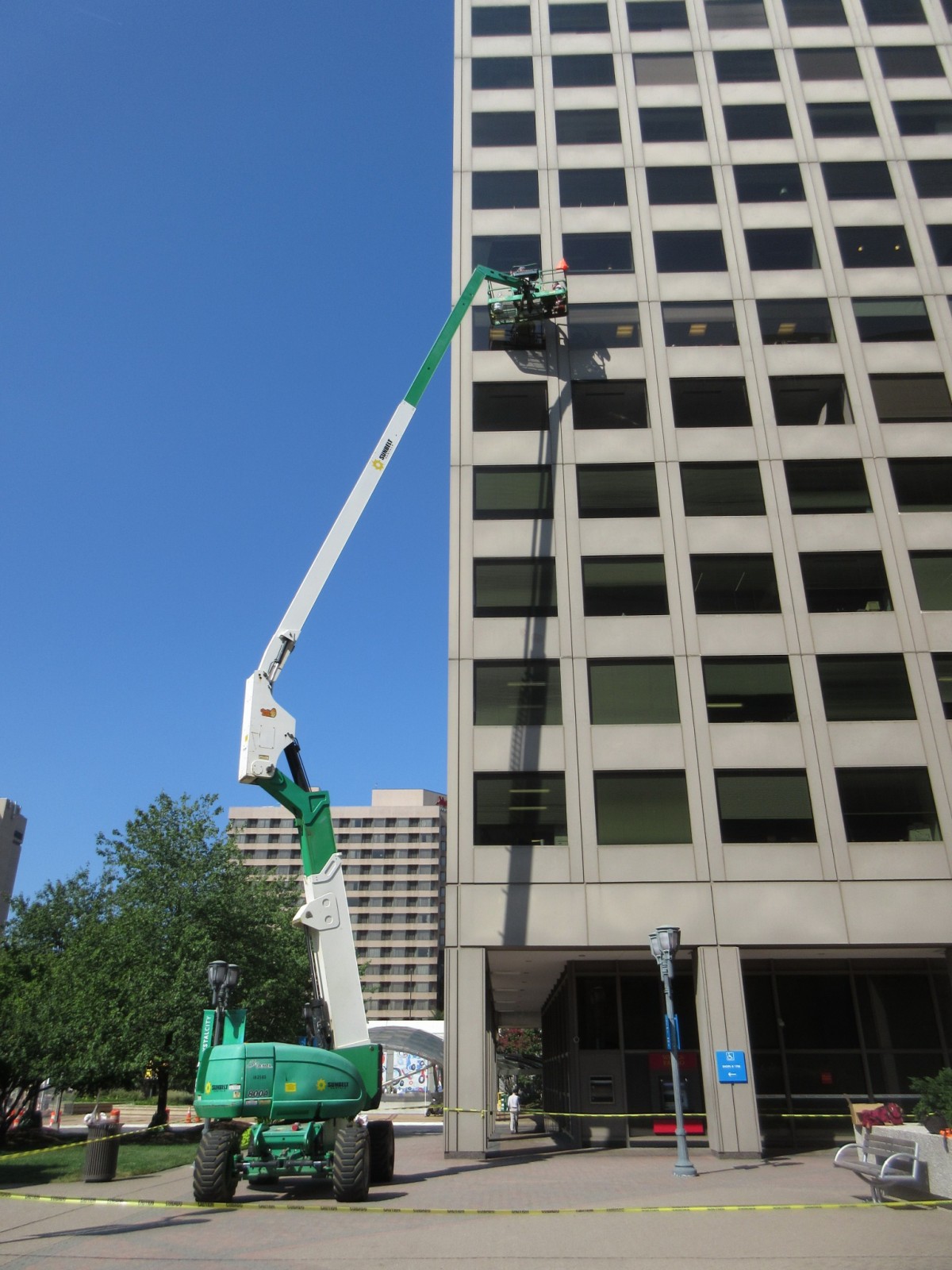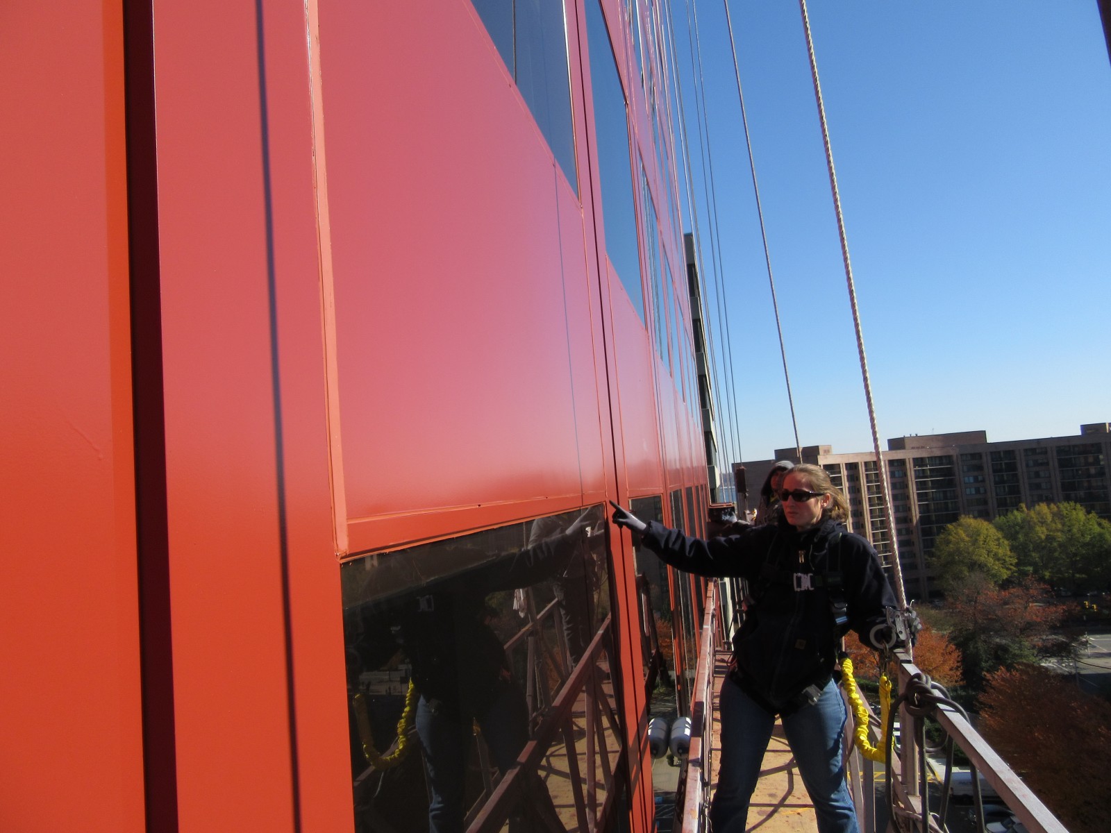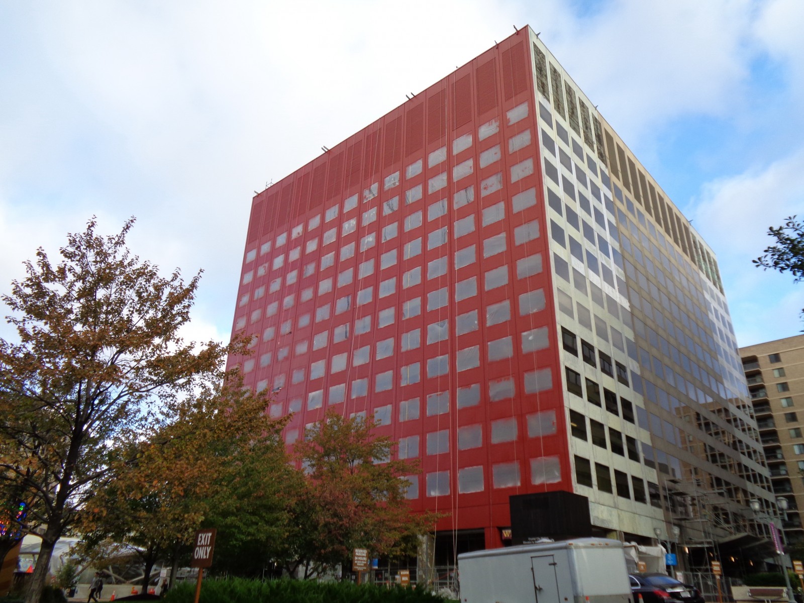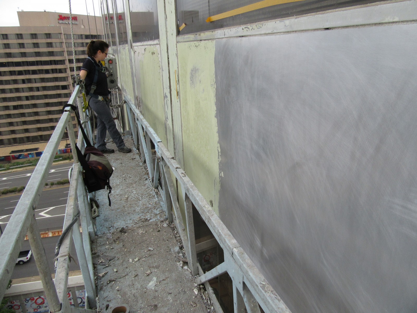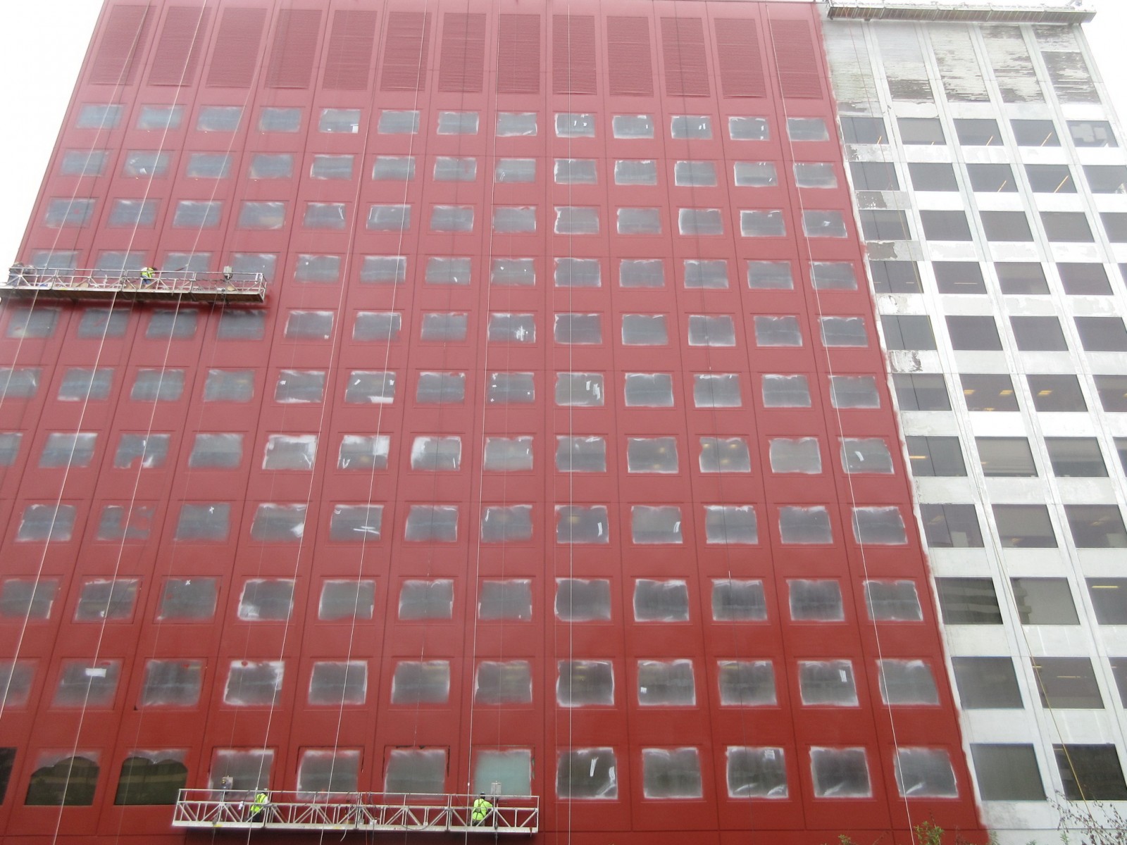 WJE completed a limited visual condition assessment of the exterior metal panels and joint sealant. To document prior repairs and problem areas, we reviewed the metal panels, window assemblies, and joint sealant, in addition to the ground-level storefronts and soffits. During the exterior survey, we also completed adhesion testing of the existing coating on the metal facade panels in accordance with ASTM D3359 and ASTM D4541. We collected coating samples for our in-house laboratory to evaluate the composition and coating types of each sample. The testing results informed contract documents pertaining to joint sealants and high-performance coatings, which were incorporated into a subsequent facade restoration project. We helped the architect of record further refine the full-scale restoration program based on a trial repair of coating removal and installation. We also provided construction period services throughout the implementation of the repairs.