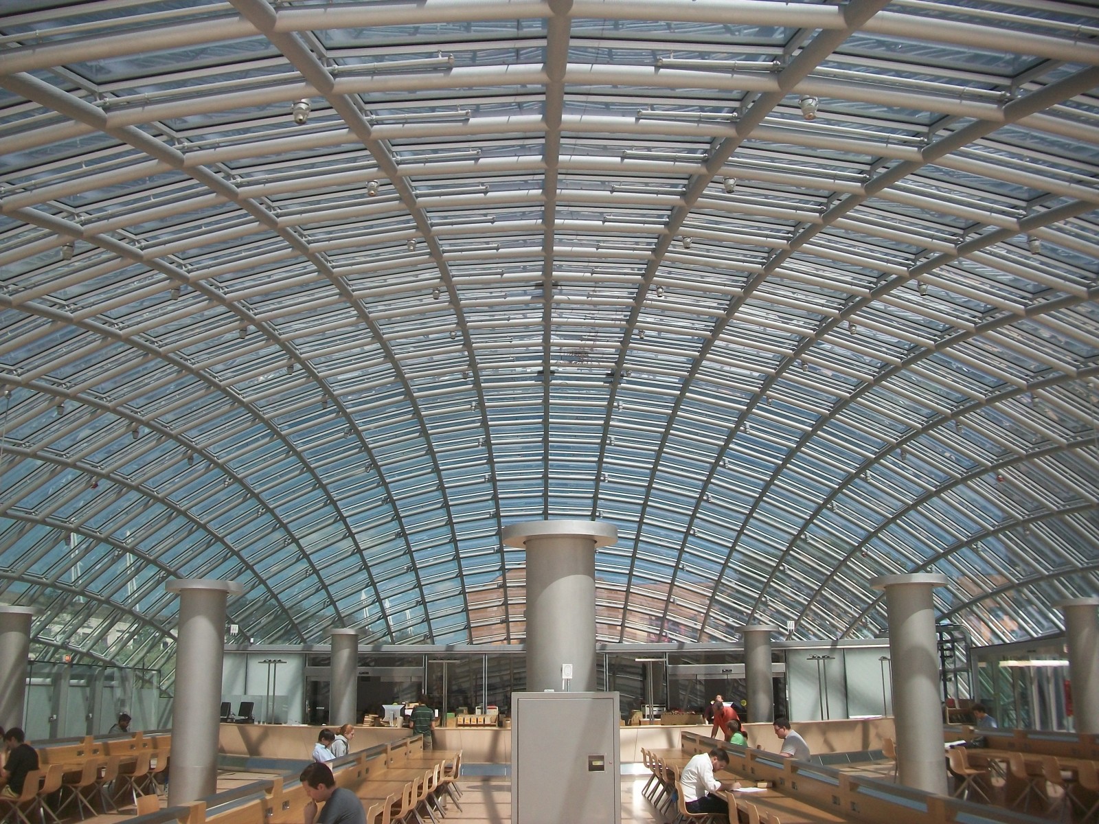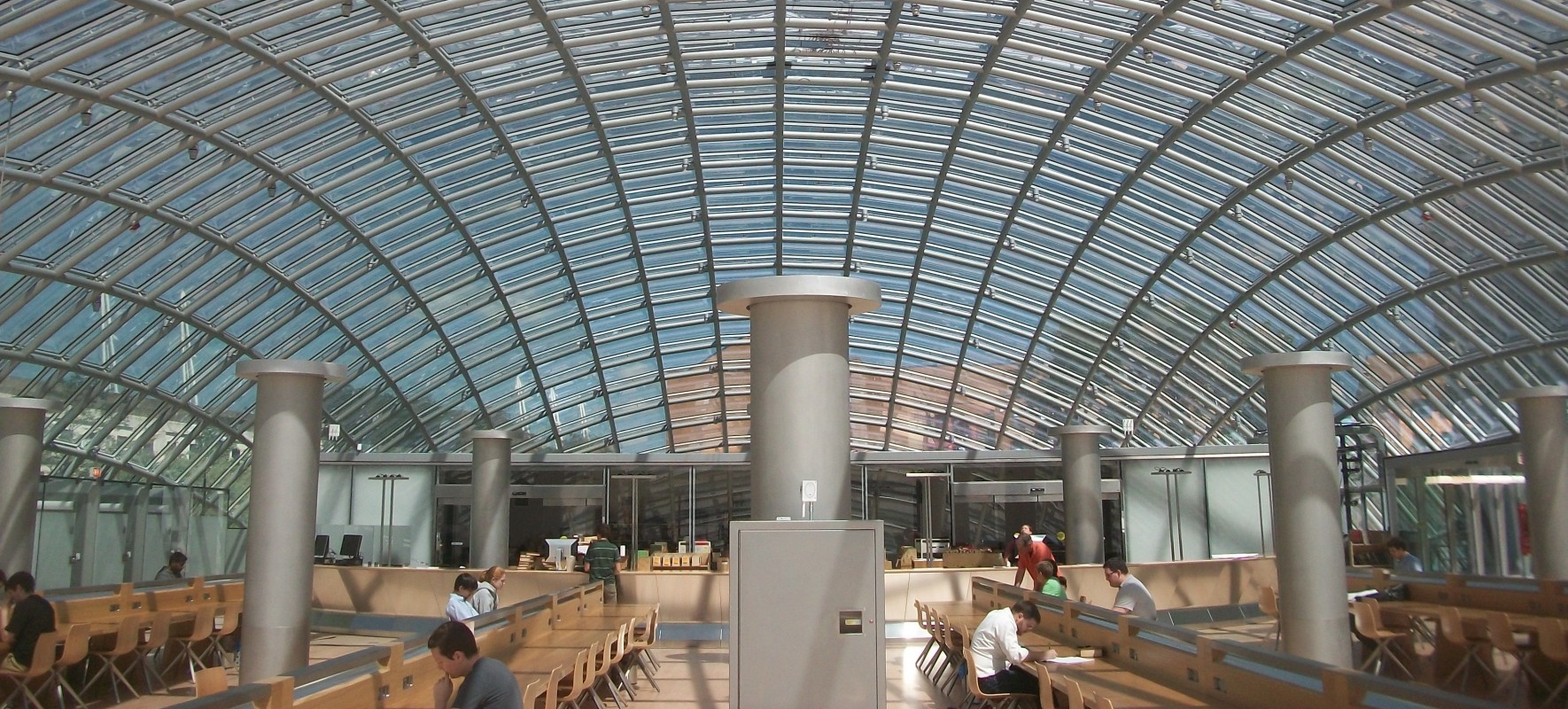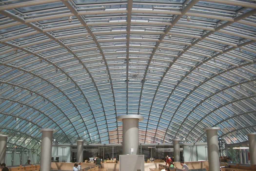 This distinctive building features a 120-foot by 240-foot glass dome enclosing a spacious oval reading room, administrative offices, and document preservation workrooms. The dome, reaching a height of 36 feet at its apex, is comprised of glazed glass panels in a rectilinear grid of mullions. The band of glass in the dome adjacent to the perimeter of the first floor is clear, and the glass in the remainder of the dome is fritted.