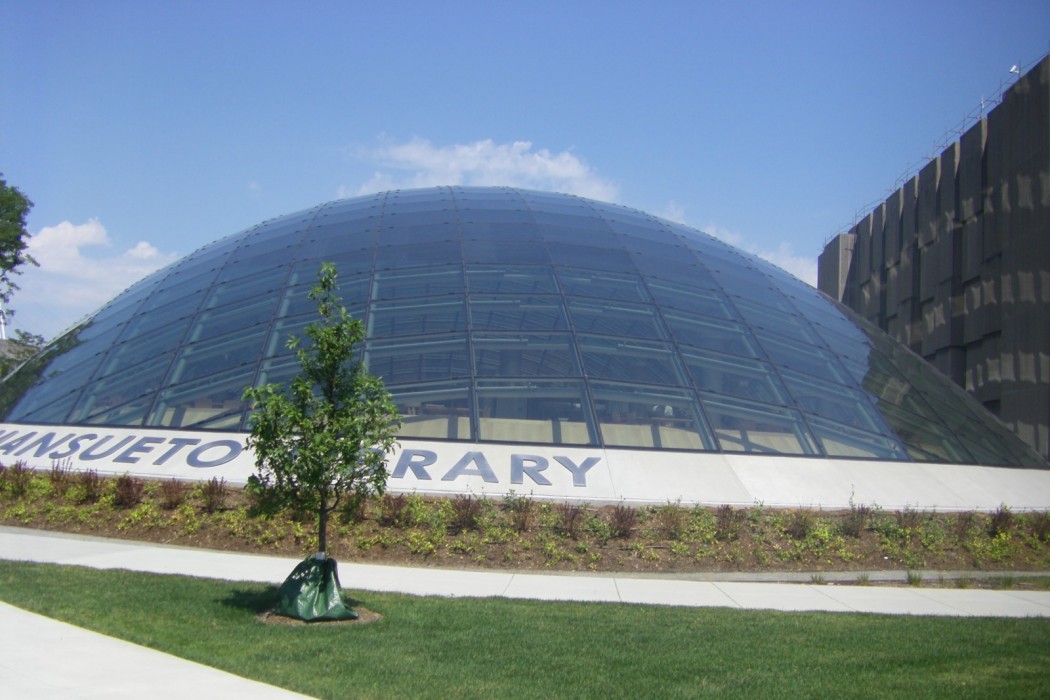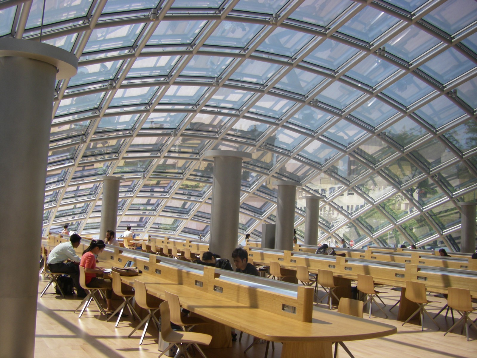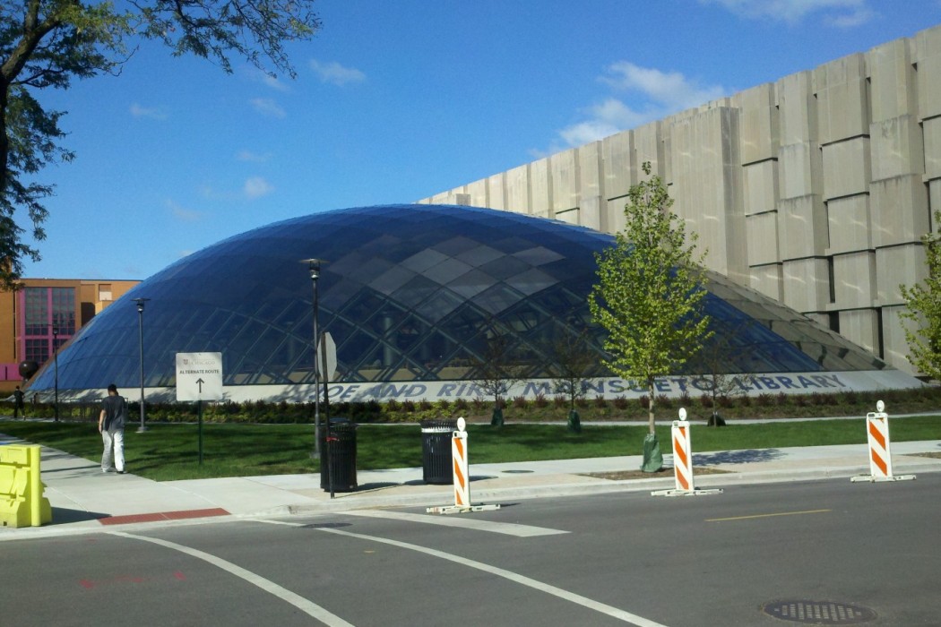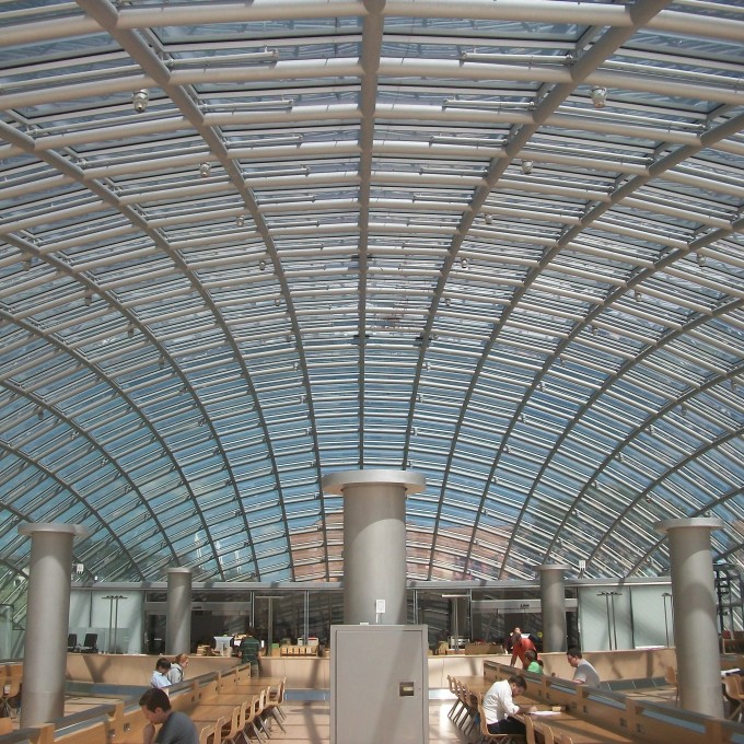 This distinctive building features a 120-foot by 240-foot glass dome enclosing a spacious oval reading room, administrative offices, and document preservation workrooms. The dome, reaching a height of 36 feet at its apex, is comprised of glazed glass panels in a rectilinear grid of mullions. The band of glass in the dome adjacent to the perimeter of the first floor is clear, and the glass in the remainder of the dome is fritted.