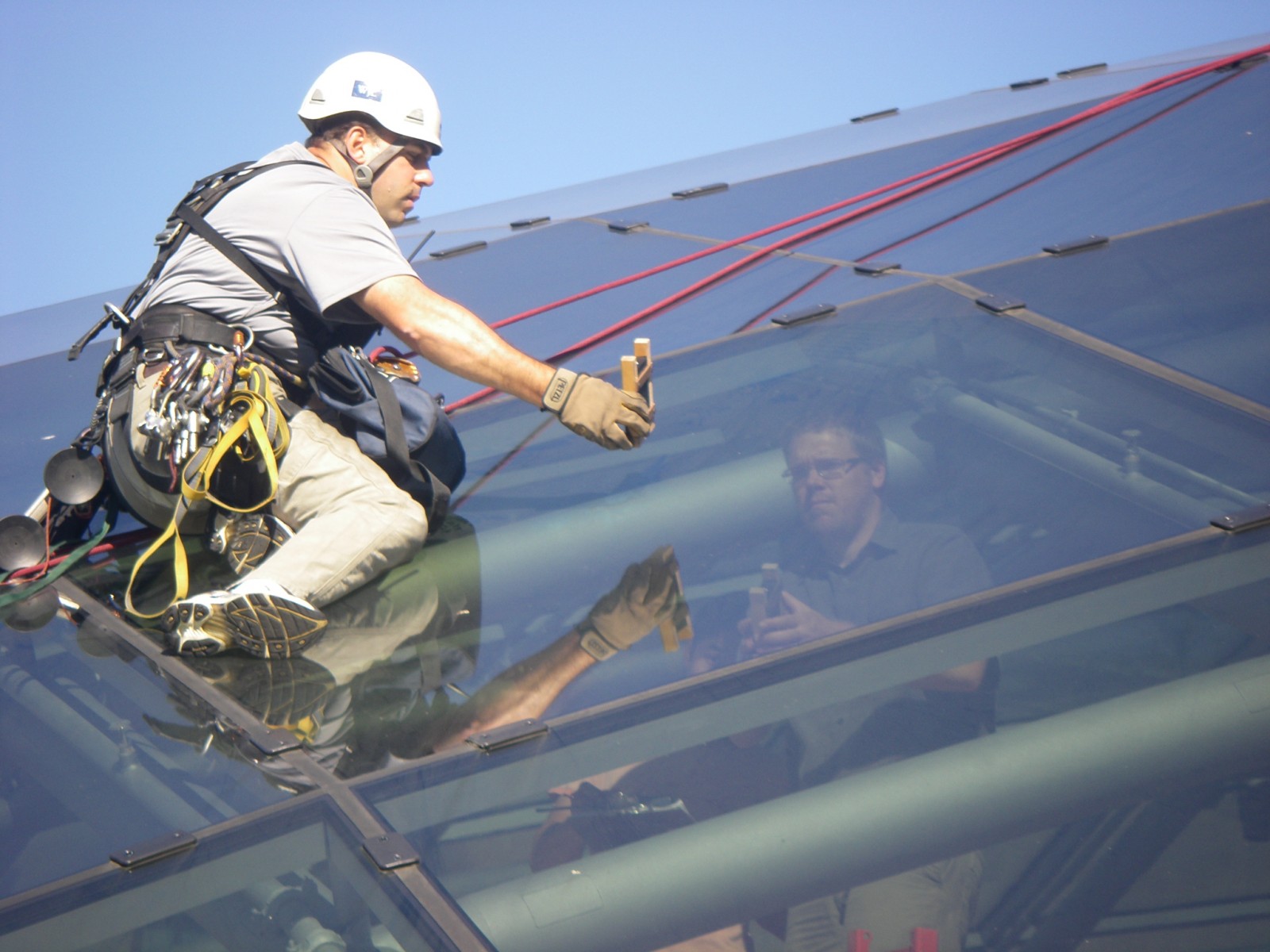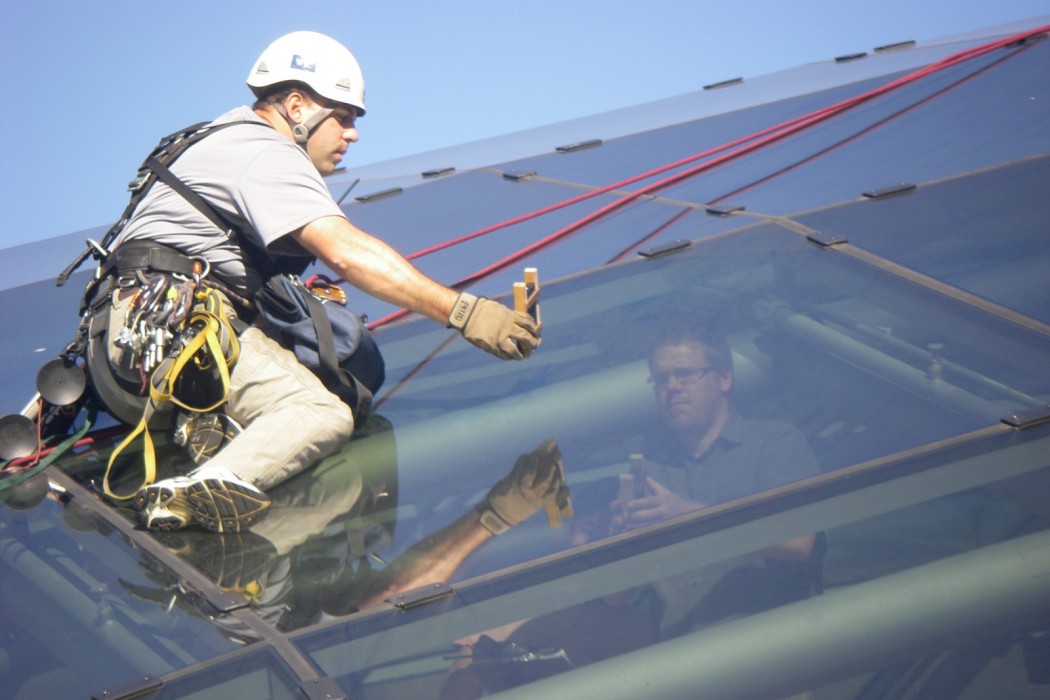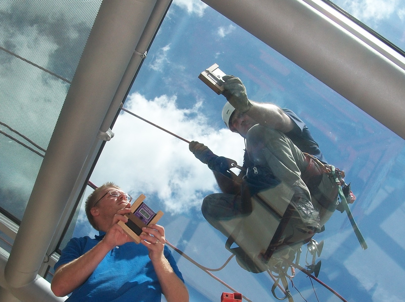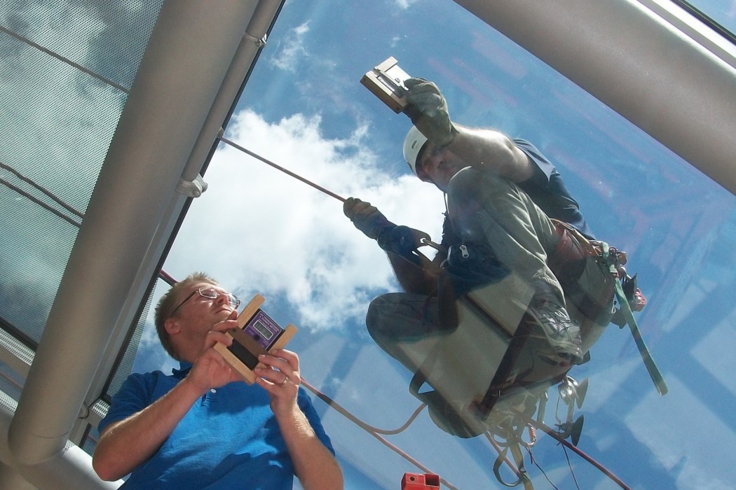 To prepare for the investigation, WJE conducted a document review of the architectural drawings, glazing shop drawings, and product submittals. The approved glass design called for panels to be 6-foot by 6-foot in size and 1 1/2-inches thick. Each panel was designed to have a UV light transmission level of less than 1 percent and a visible light transmission level of 49 percent. In teams of two people, WJE performed in-situ testing of the as-built glass on twenty-six individual panels located around the dome. Corresponding measurements of UV and visible light levels were simultaneously taken at identical interior and exterior locations, using identical equipment, at times and locations of the most direct sunlight. The results of the testing revealed that the transmission of UV and visible light through the as-built glass conformed to the specified levels. In addition, WJE did not detect any locations of UV or visible light concentration under the dome. Thus, WJE concluded that the glass panels performed in accordance with the approved design.