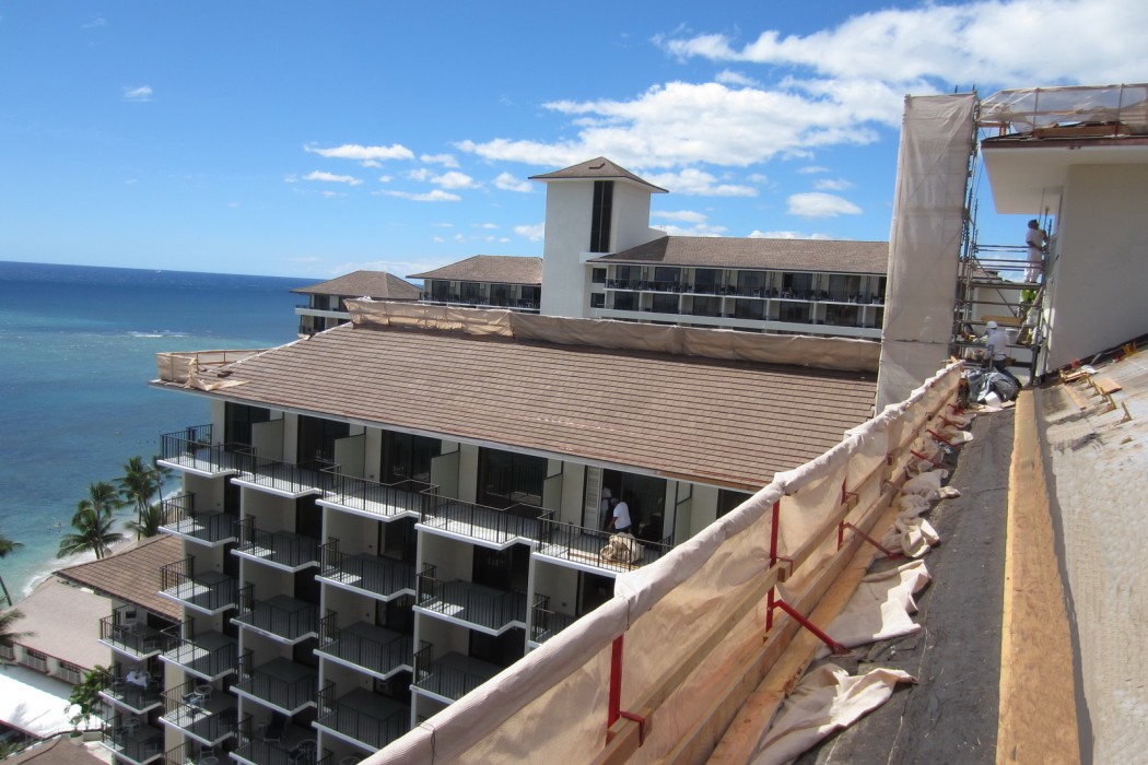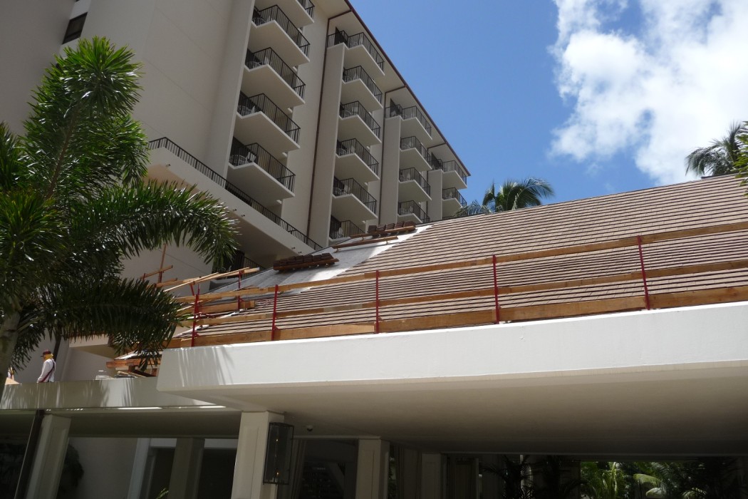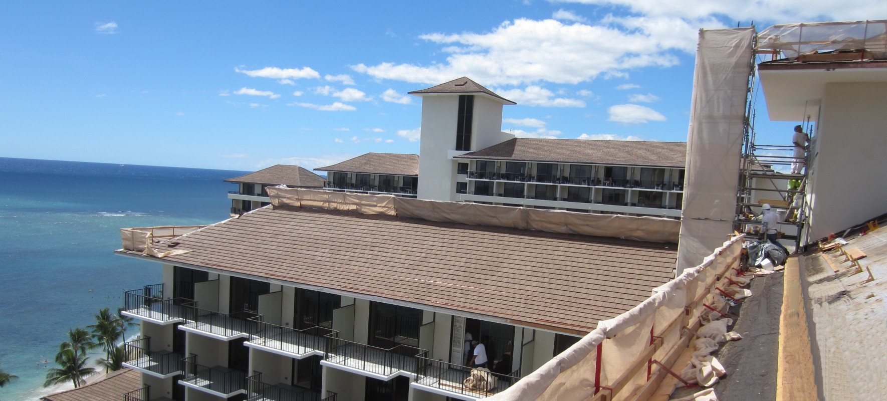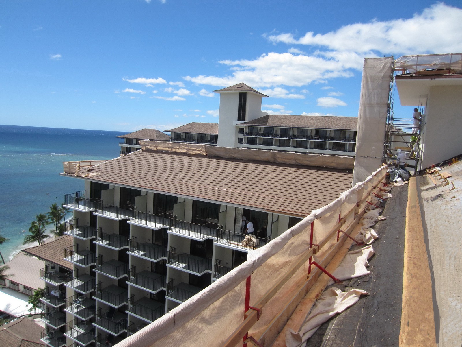The Halekulani Hotel is a high-end luxury hotel situated on the Waikiki shore line. The hotel consists of multiple high-rise guestroom towers organized around courtyards with open-ended views to the adjacent oceanfront Waikiki boardwalk. The tower structural systems consist of a cast-in-place concrete frame and deck supporting steel-framed roofing substructure. The tower roofs vary in height from the inland side of the site to the ocean front property line to break down the massing of the towers and provide for framed views from guestrooms over the stepped towers steep slope roofs.