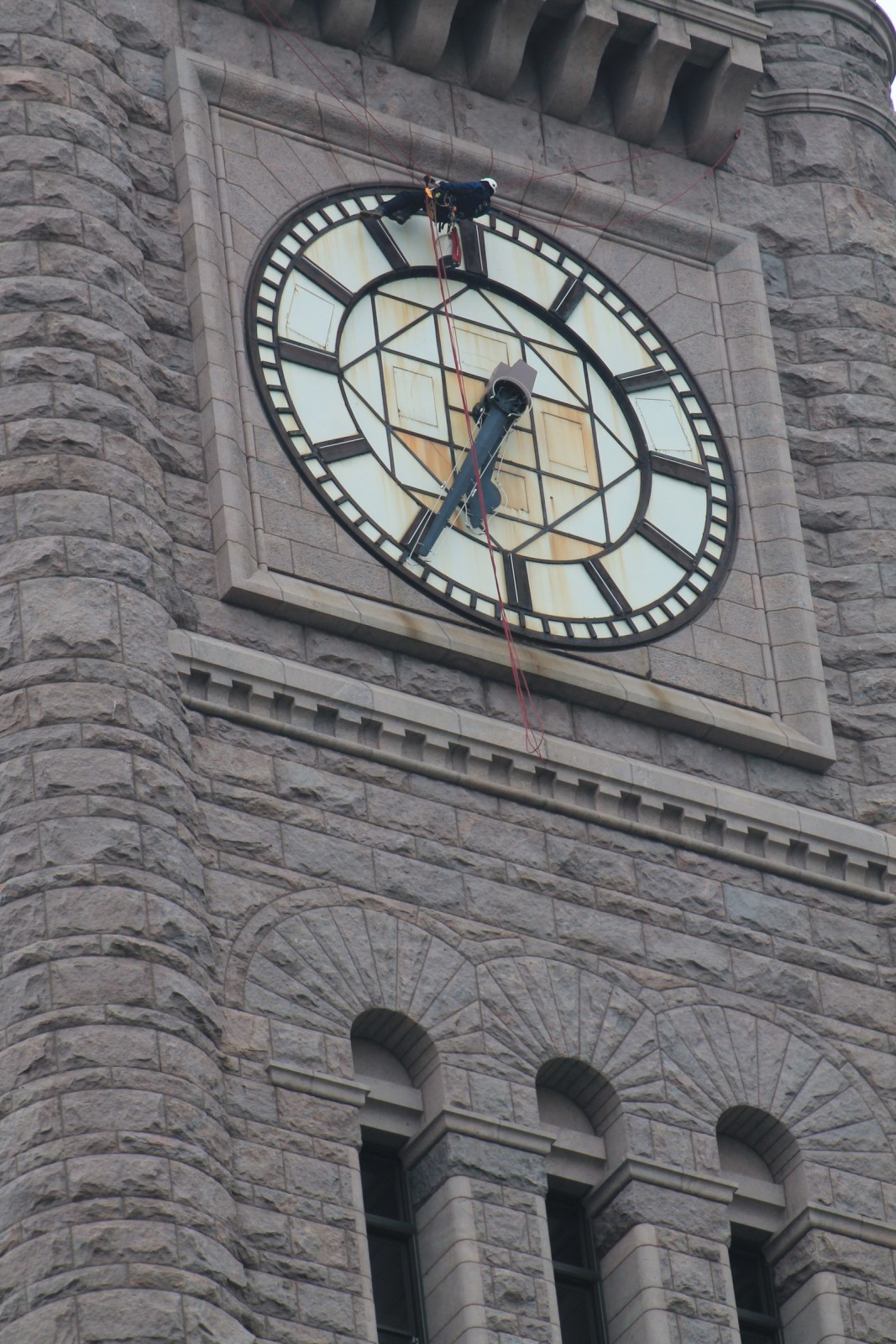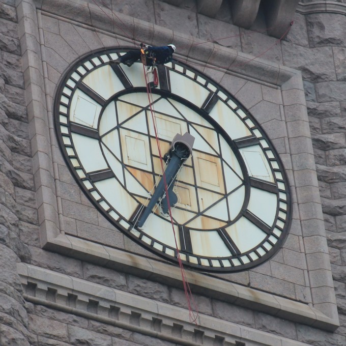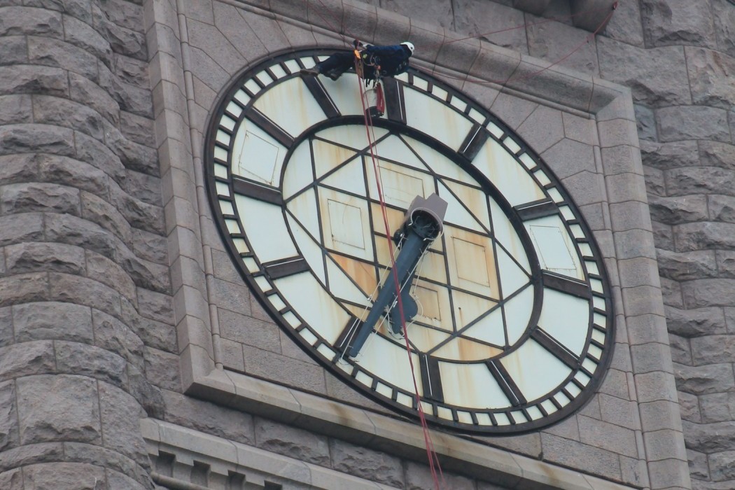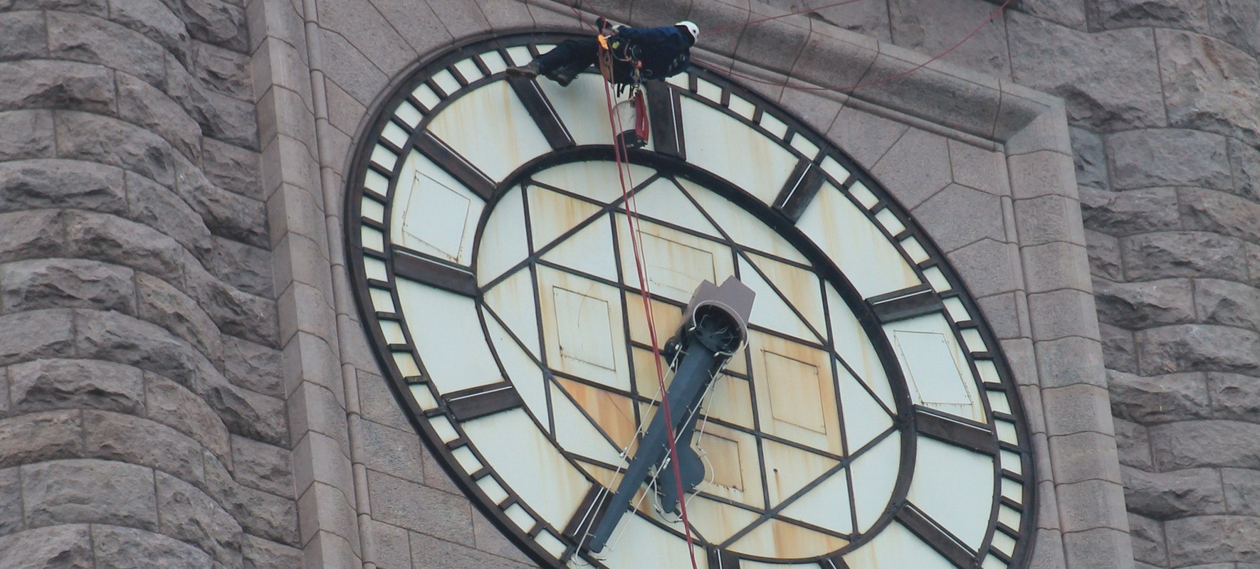 WJE assembled a team of engineers with necessary expertise to safely and economically assess the structural condition of the clock faces after a century of exposure in a harsh northern environment, decades of deferred maintenance, and a variety of modifications implemented over the years. Using specialized rope access techniques, WJE’s Difficult Access Team (DAT) rappelled down the tower of the clock, documenting deterioration—including cracking and corrosion—and removing loose steel fragments that could become falling hazards. The DAT used electronic tables and WJE Plannotate—a proprietary software application—to efficiently collect and organize visual observations, photographs, measurements, and the results of nondestructive testing.