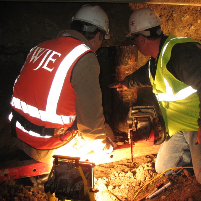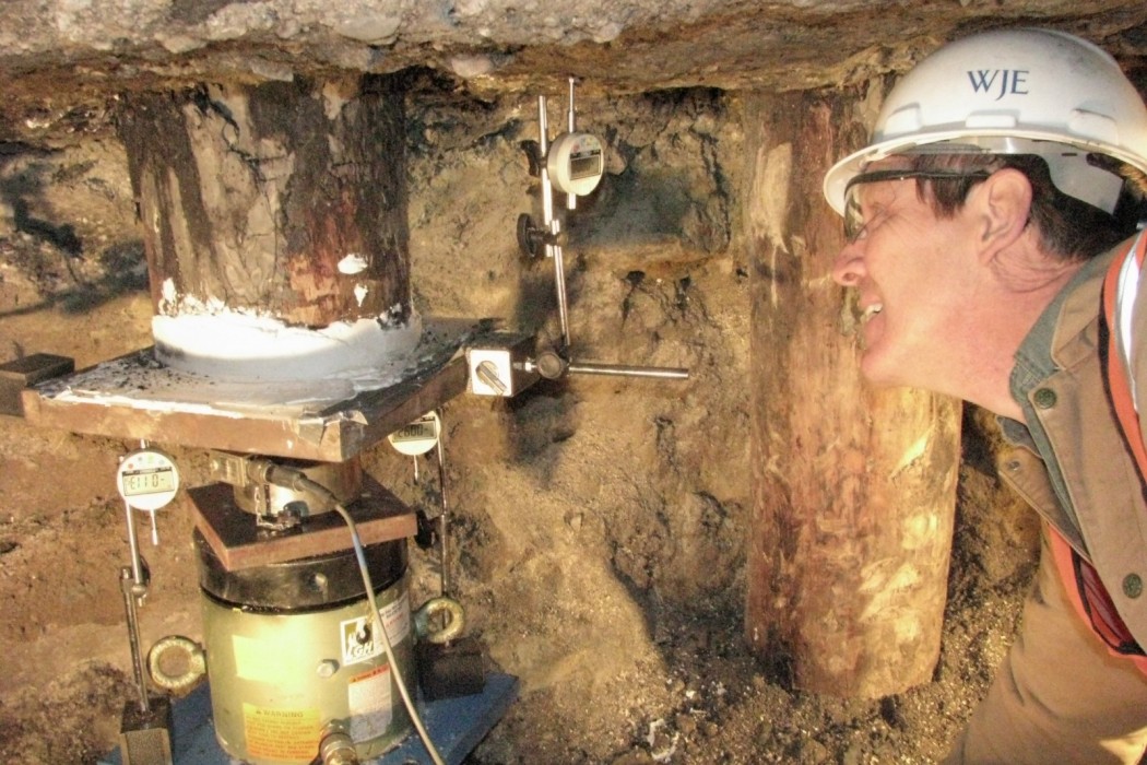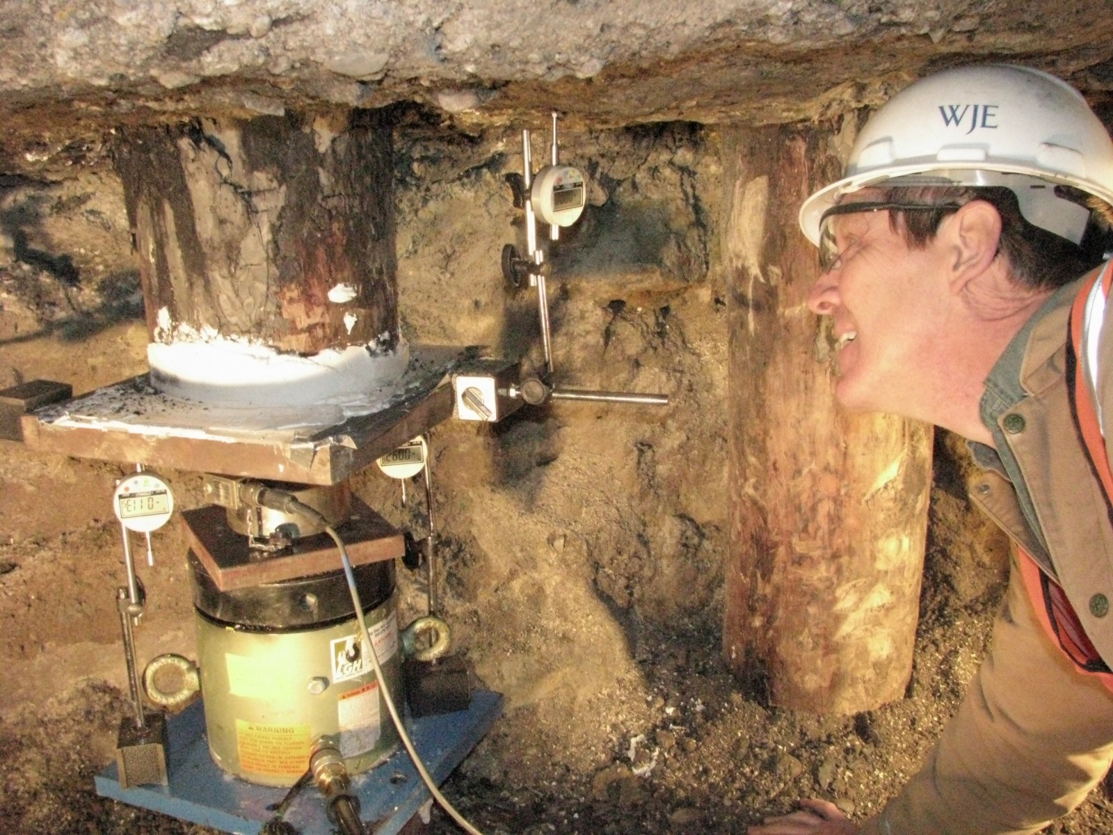 WJE assessed the condition and structural capacity of the existing elements via in situ and laboratory testing; load rated the existing structures relative to the anticipated design loads; and developed repair strategies for the concrete structures and timber piles. Concrete deterioration, especially along the deck expansion joints and at column bases, was found to be advanced but repairable. Analysis and load testing demonstrated that the repaired deck could support the desired train loads. Of approximately sixty timber piles exposed in four large test pits, advanced decay was found at the tops of several. Still, based on field load testing of select piles, pathological examination of wood cores, laboratory testing of full-size partially decayed pile sections, testing of small clear wood samples, and Monte Carlo analytical simulation of pile group capacity, WJE was able to demonstrate that piles in the northern two-thirds of the site should have adequate residual capacity for the desired loads over the fifty-year service life.